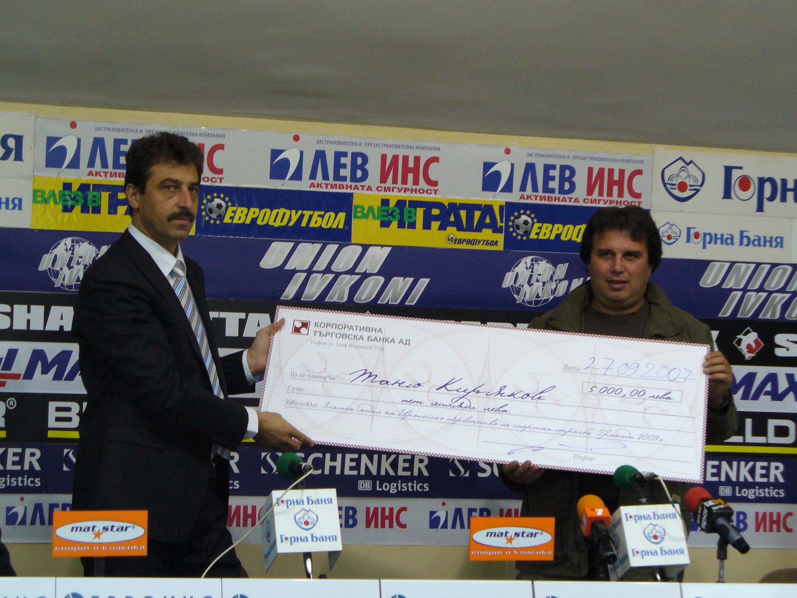 Днес в Пресклуб „България" Цветан Василев, Председател на Надзорния съвет на Корпоративна търговска банка АД, връчи наградата „Голям чек" на златния ни медалист от Европейското първенство по спортна стрелба Таню Киряков. Стойността на премията за нашия шампион е 5 000 лв.